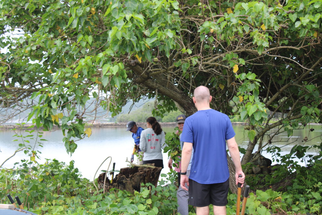 The group split up to tackle the hana, trimming the milo along Kaneohe stream and the mauka side of the pond, removing rubbish, and removing mangrove. It was hard and satisfying work, and we closed out around 11 to hui up before the usual lunch. Everybody offered one word which they got out of the day: kilo, beauty, fun connecting proud pono endless happy, clear, self-sustaining, nice, balanced, peaceful, community, sustainable, pilina, kuleana, appreciation, refreshed, green, opportunity, fulfilled, progress, full, aloha, grateful…